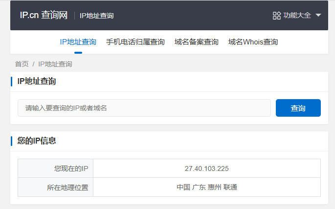 ip.cn 在线 IP 查询工具,支持查看公网 IP、地理位置、运营商信息及网络归属地,提供 Whois、备案、DNS 等多种网络查询功能,快速获取 IP 相关信息。